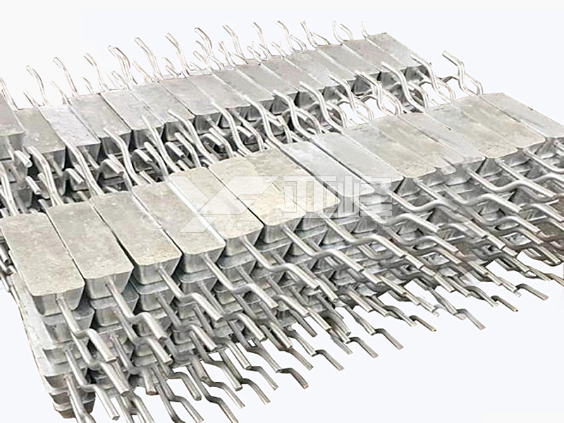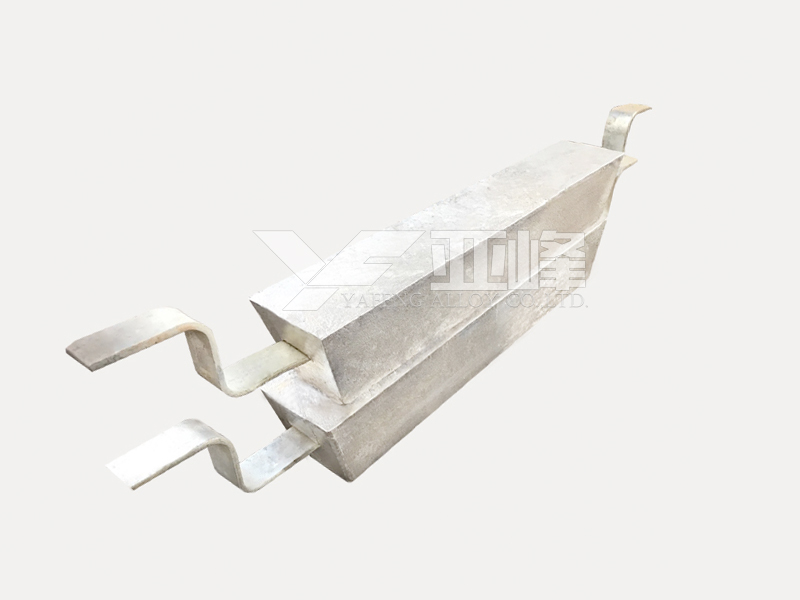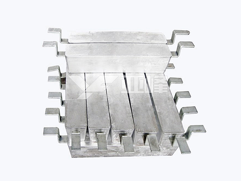 常用的鋁合金陽(yáng)極有Al-Zn-In系和Al-Zn-Hg系陽(yáng)極,適用于海水中的船舶、碼頭港口與海洋設(shè)施、海水冷卻水系統(tǒng)和儲(chǔ)罐沉積水部位等構(gòu)筑物的陰極保護(hù)。鋁鋅銦系(AZI系)犧牲陽(yáng)極是用高純度鋁及鋅、銦等金屬合金化而鑄成的。鋁合金陽(yáng)極生產(chǎn)執(zhí)行GB/T4948-2002《鋁-鋅-銦系合金犧牲陽(yáng)極》。